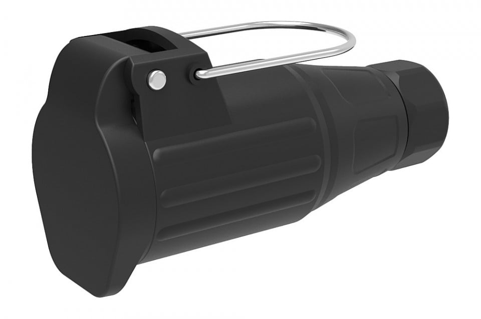 Fisa unghiulara neagra cu insertie termoplastica din elastomer, terminale cu surub pentru cabluri de pana la H07RN-F 3 x 2,5 mm?, tip DIN 49441-AR2. pentru 2 sisteme de contact de protectie, de exemplu, si pentru sistemul de prize belgian-francez. IP44, 16 A