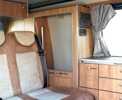 Piesa de bucatarie fara tehnologie. Cu spatiu pentru combinatie aragaz-chiuveta (decupat 600x455mm), frigider cu compresor aprox. 39 litri, Porta Potti 335 (articolul 660101). Echipament: masa pivotanta, 2 sertare mici, 2 compartimente de depozitare mai mari, blat, antracit laminat cu margini din lemn, decor alb lucios laminat.