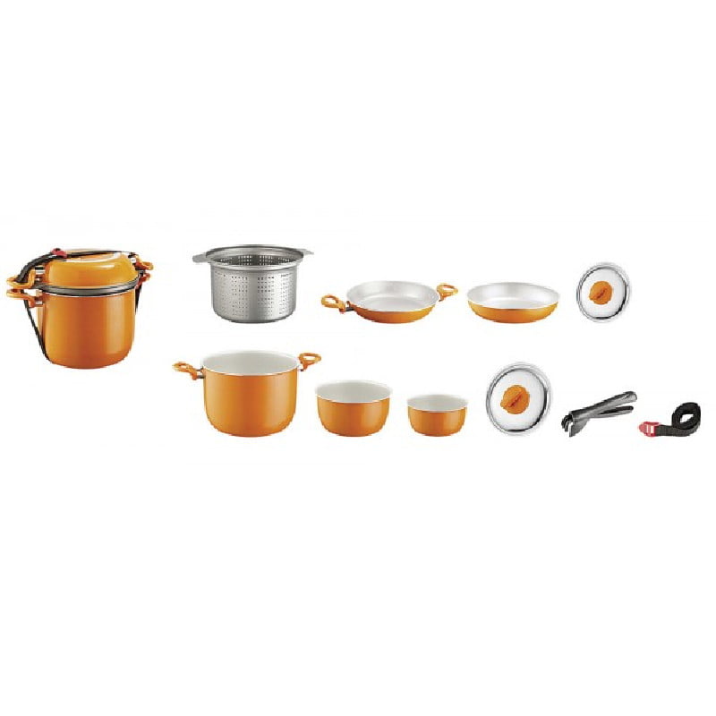 Potrivit pentru urmatoarele tipuri de sobe: gaz, electric, ceramic, cu inductie.Este format din:1 oala ? 22 cm de 5 l,1 oala ? 18 cm de 1.4 l,1 tigaie ? 20 cm de 1.5 l,1 tigaie ? 22 cm de 1.5 l,1 capac ? 22 cm,1 capac ? 22 cm / ? 20 cm / ? 18 cm,1 maner detasabil,1 curea. Culoare: albastru. Material: aluminiu.
